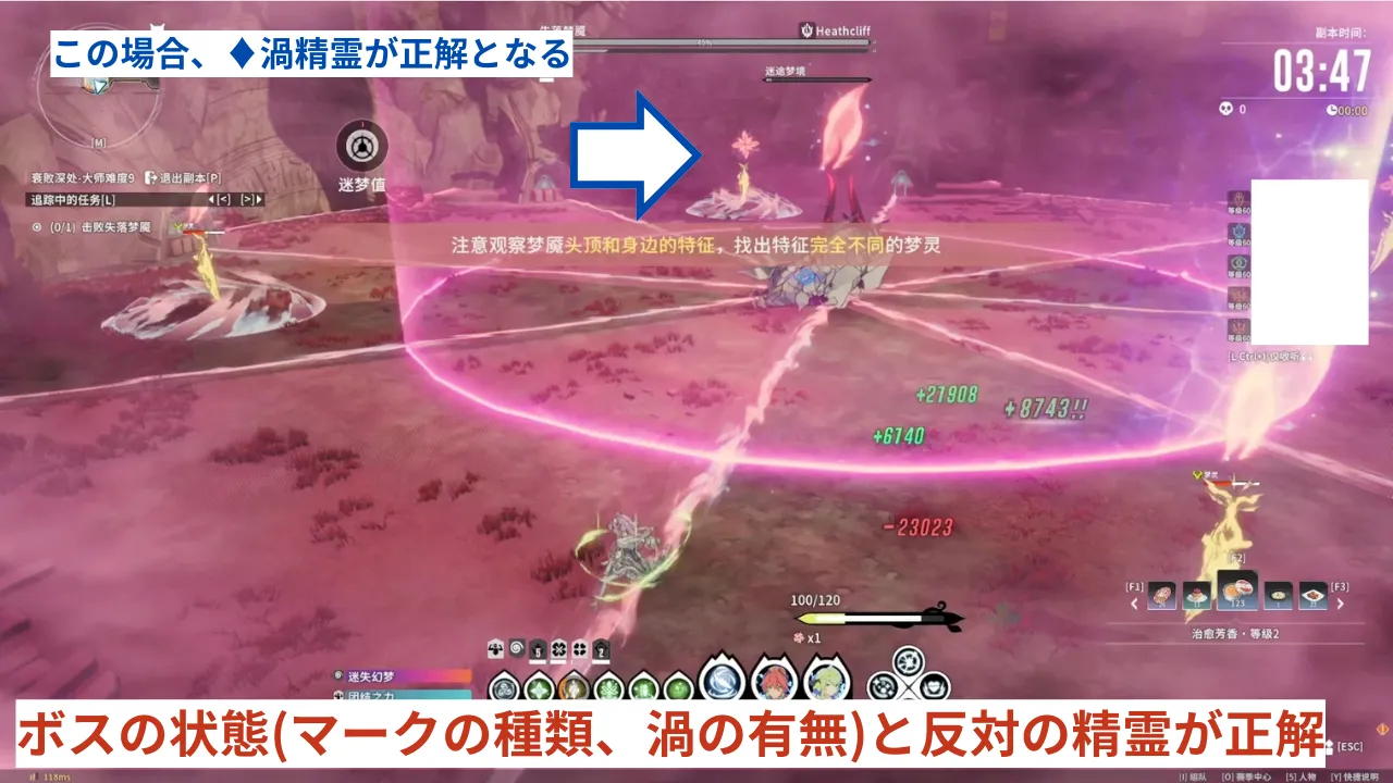 - 正しい精霊は、ボスの状態(マーク・渦の有無)と反対の精霊