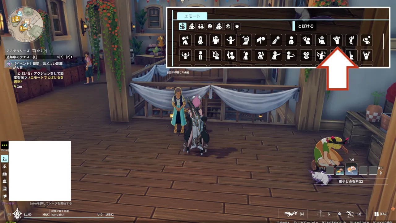 エモートを利用するクエストなので、分かりやすいように画像を作成してみました。