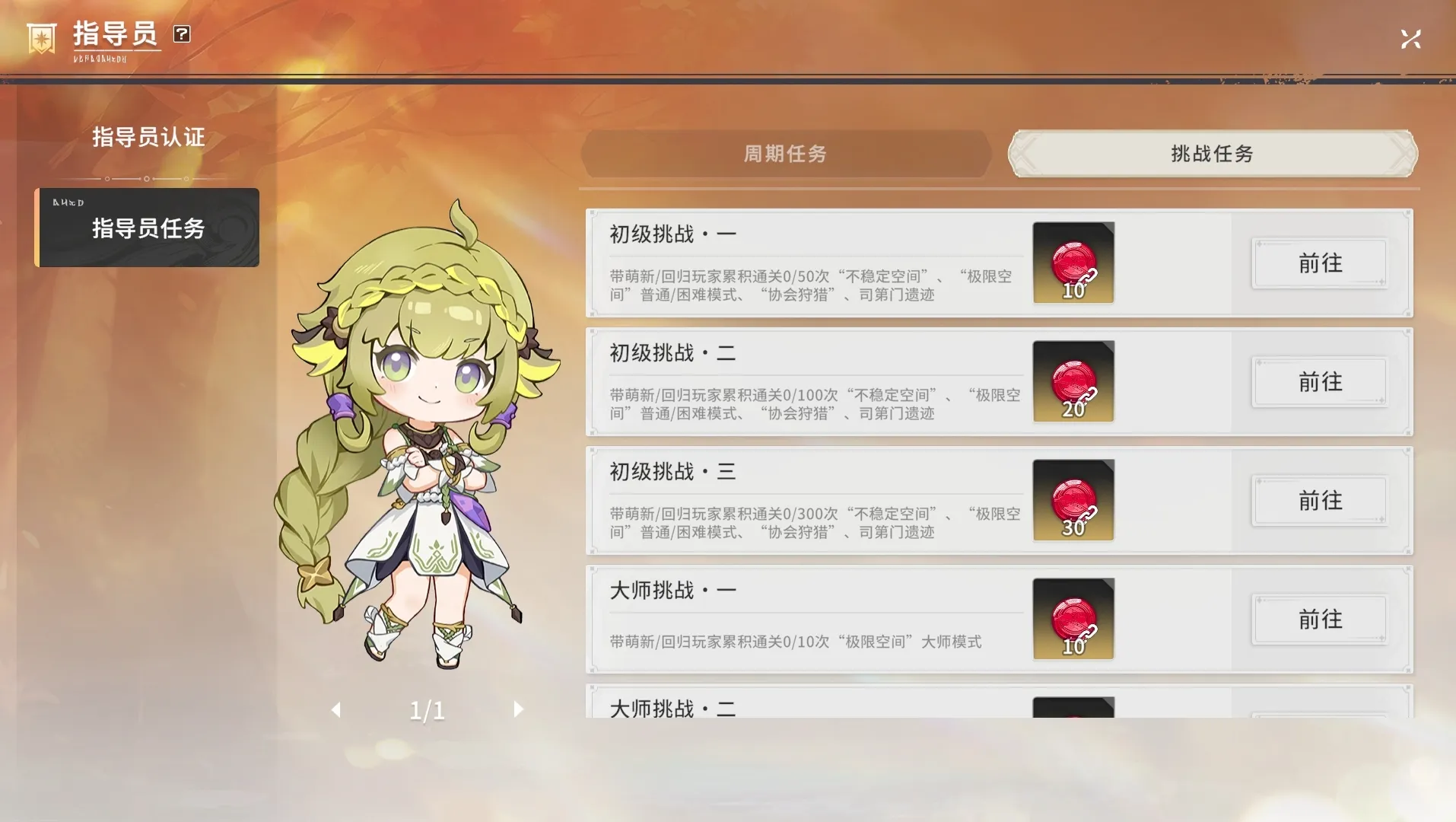 - 新人/復帰プレイヤーと一緒に、「不安定空間」「極限空間」ノーマル/ハード、「協会狩猟」、「司第門遺跡」を累計(50/100/300)回クリアする。