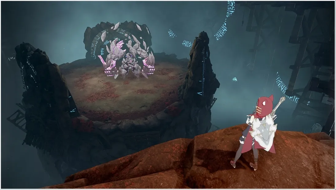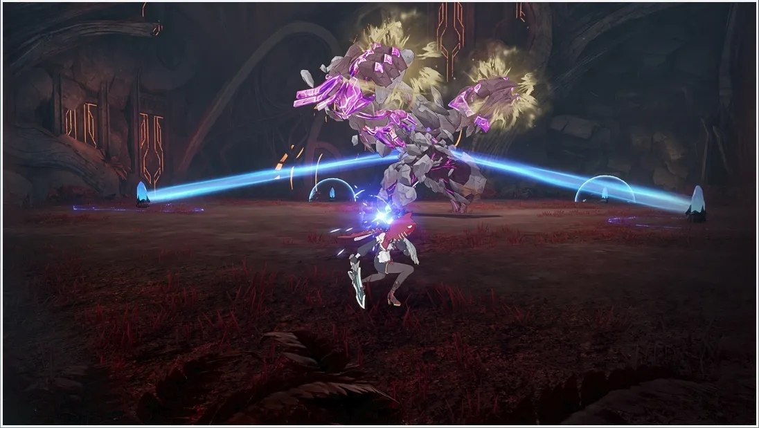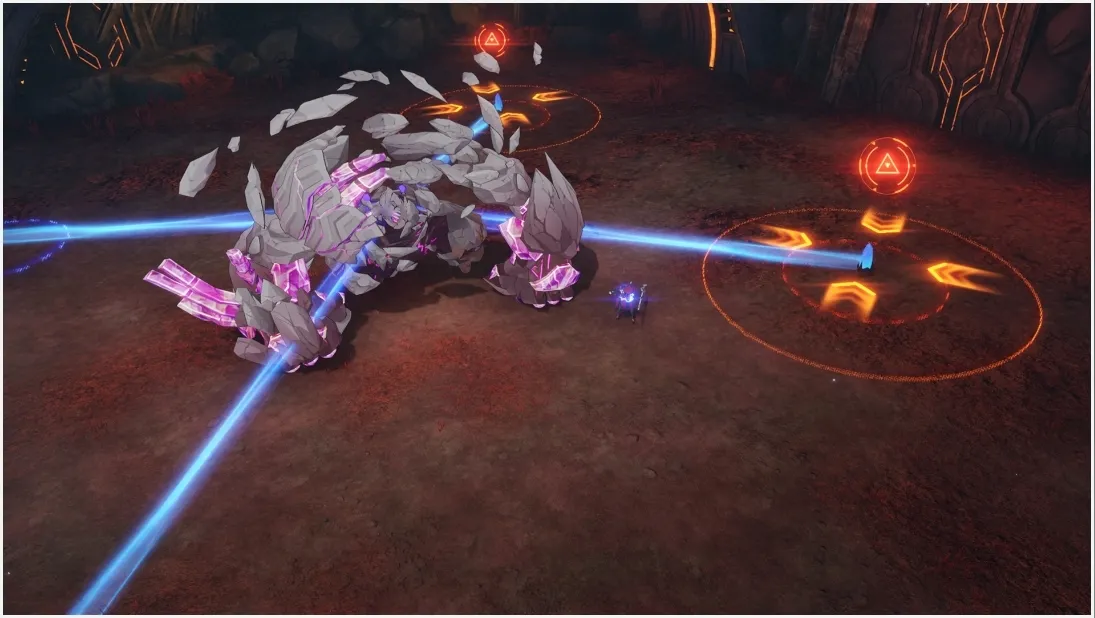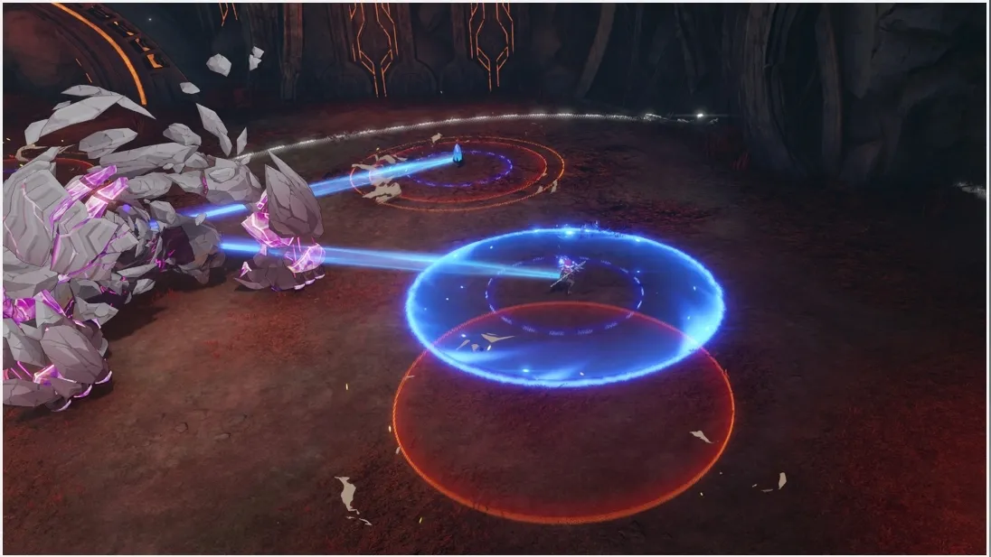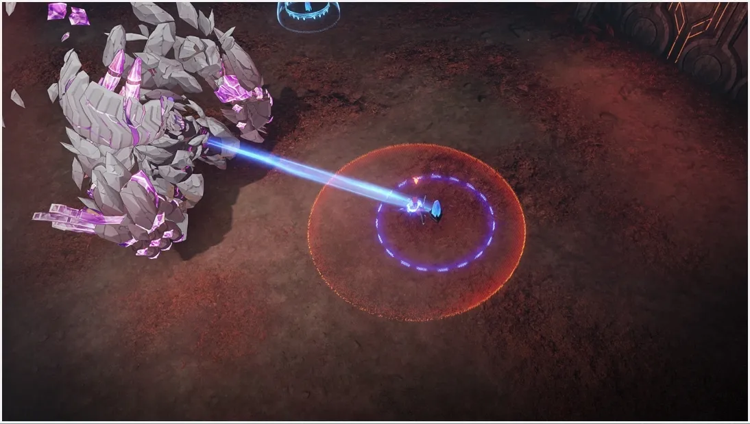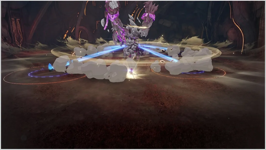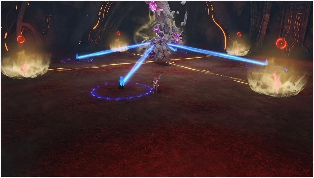 遺跡の装置に石骸の強力なスキルが命中すると防御システムが作動し、広範囲爆発を起こして全プレイヤーにダメージを与え、その後も一定時間ダメージが持続します。