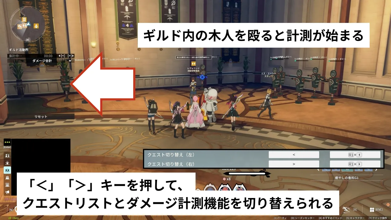 デフォルト「<」「>」キーを押して、計測機能に切り替えてギルドにある木人を殴るとダメージを計測してくれます。